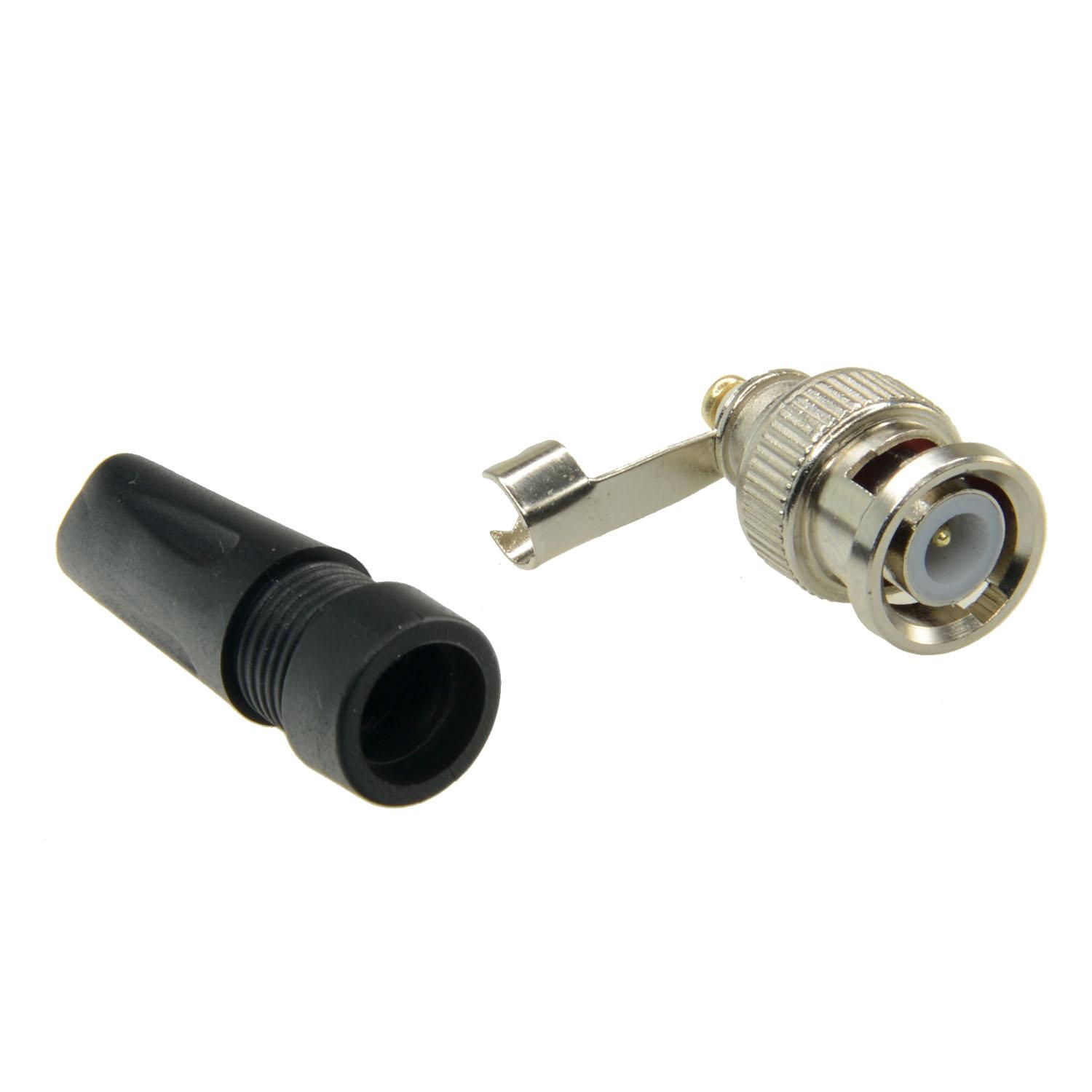 Connettore maschio BNC Safire da avvitare. Il conduttore del cavo è avvitato direttamente al connettore, quindi non è necessario alcuno strumento di crimpatura, solo un cacciavite. Connettore universale, valido sia per cavo RG-59 che per Micro Coassiale.