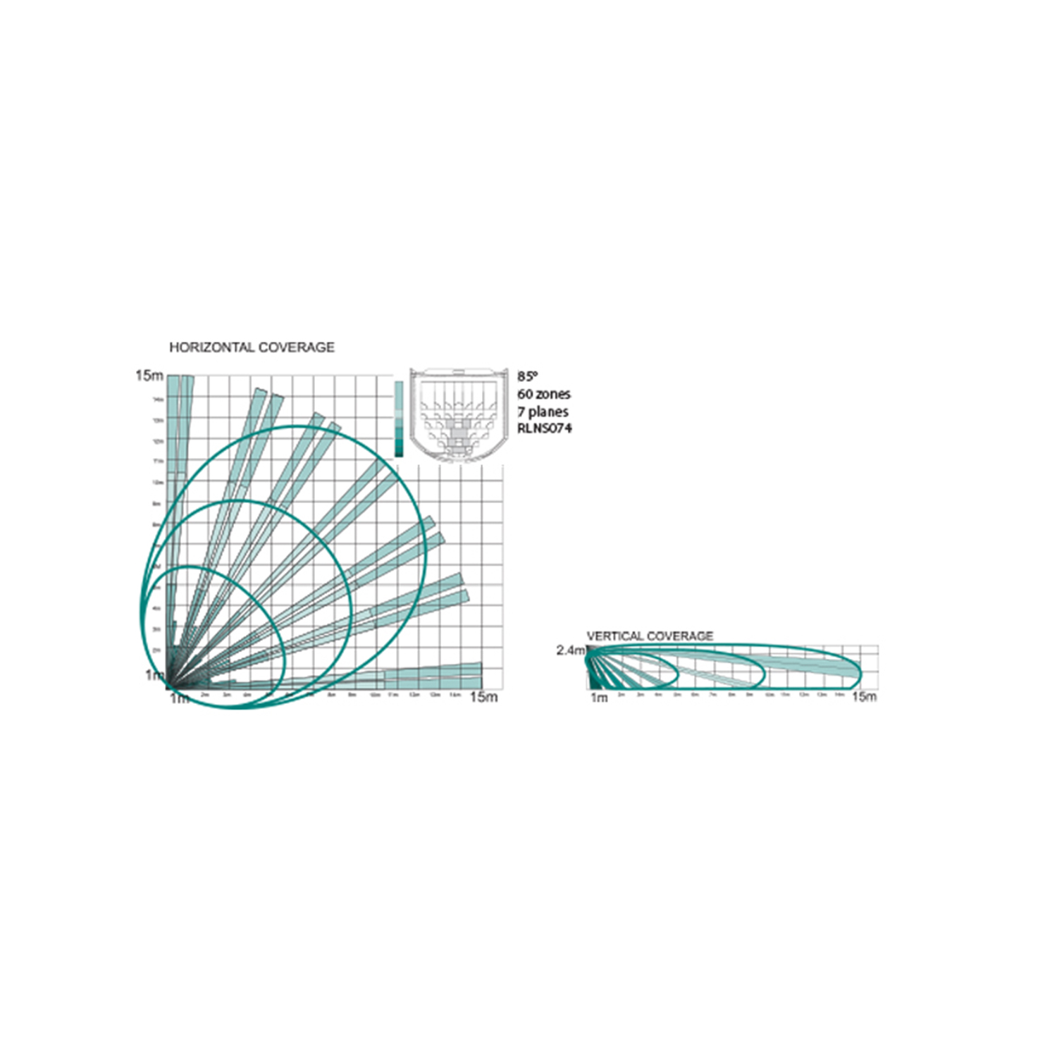 | Gamma di rilevamento | 15 m / 85º per altezza di installazione = 2,4 m |