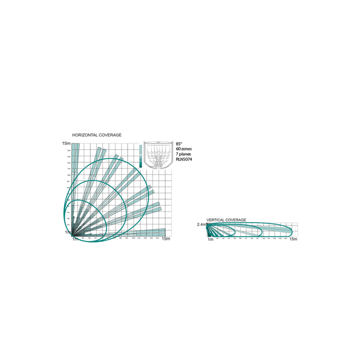 | Gamma di rilevamento | 15 m / 85º per altezza di installazione = 2,4 m |