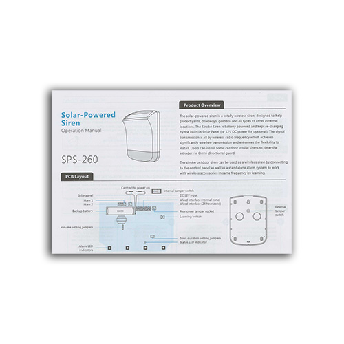 Sirena 110 dB adatta per esterno, alimentata da pannelli solari, con lampeggiante. Comunica in modalità wireless con la centrale di allarme, e quindi quando viene rilevata un'intrusione o un evento, oltre a far suonare la sirena interna della centrale, questa potente sirena suonerà e si accenderà.