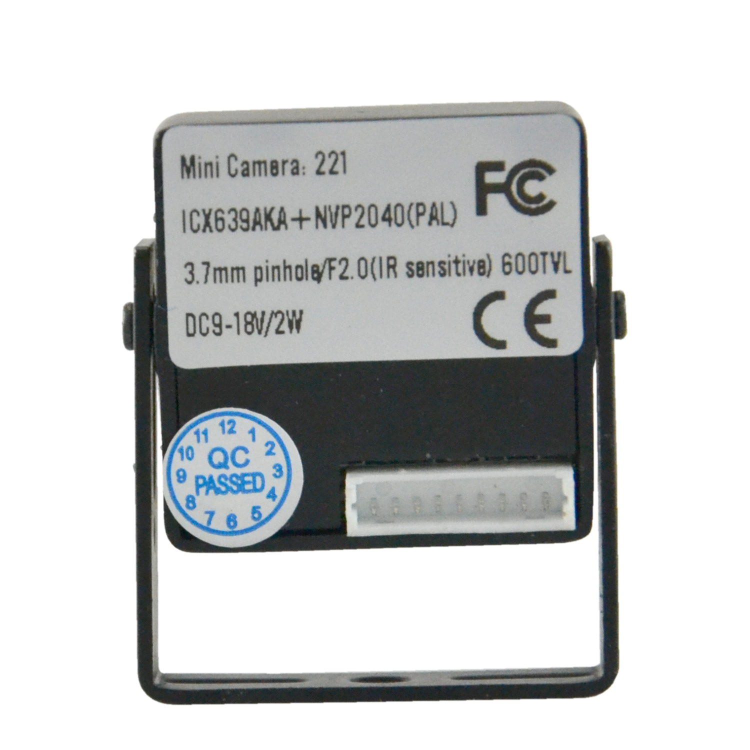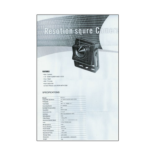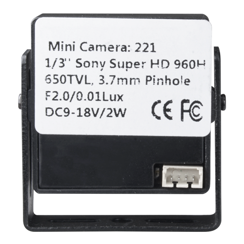 Sensore Sony© 1/3" 960H Super HAD CCD II (modello ICX663AKA) e DSP Nextchip© (modello NVP2040) e una risoluzione di 600 TVL. Obiettivo fisso da 3,7 mm foro stenopeico con diagonale campo visivo di 79° Illuminazione minima di 0,3 Lux Collegamento video tramite connettore BNC